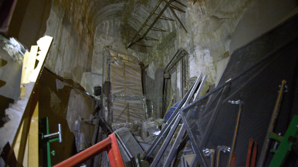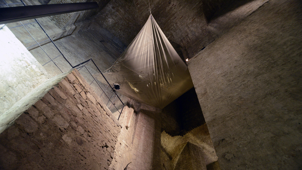Un telo per raccogliere l’acqua nella Sala cannoniera